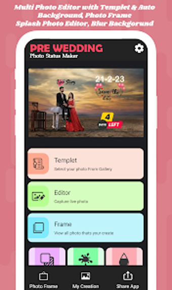 De app biedt zes opvallende functies, waaronder een fototemplate-functie die automatisch de achtergrond van geselecteerde foto's snijdt, en een krachtige foto-editor met verschillende filters en stickers. Gebruikers kunnen hun foto's verder bewerken met een vierkant fotokader, een vervaagde achtergrond, en een splashes effect. Daarnaast maakt de functie 'Cut - Paste Photo' het eenvoudig om foto's van de galerij te selecteren en deze op een nieuwe achtergrond te plaatsen, waardoor het een veelzijdige tool is voor elke aanstaande bruid of bruidegom.
